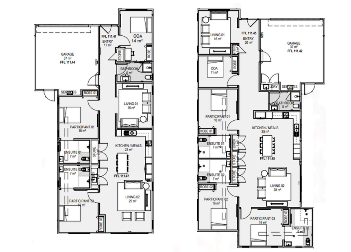 The right home features two bedrooms, while the left offers three, with each bedroom including a private ensuite and an Onsite Overnight Assistance (OOA) room for 24/7 support. Both homes feature open-plan kitchen, dining, and living areas, a second lounge, and wide hallways and doorways for effortless accessibility. Kitchens are fully equipped with adjustable benchtops, side-opening ovens, lever-handle tapware, push-to-open cabinetry, and pull-out drawers, while bathrooms include roll-in showers.